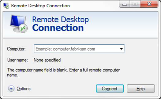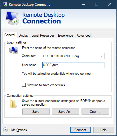 - You may need to click the Options button to see the full Remote Desktop Connection options so that you can enter your password. Refer to the images below.
